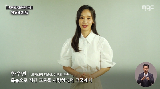 이 영상에서 한수연은 "목숨으로 지킨 그토록 사랑하셨던 고국에서 이제는 평안히 영면하시기를 바라겠습니다"라는 메시지를 남겼다.