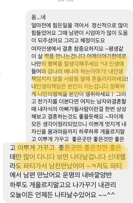 그는 "얼마 전에 힘든 일을 겪어서 정신적으로 많이 힘들었다. 그때 남편과 시엄마가 많이 도움됐다. 혜정이도 그렇다"라며 "여자 인생에서 결혼 참 중요하다. 평생 같이 살 짝을 만나는 거기 때문이다. 어제 얘기한대로 나만의 행복을 잘 생각해라. '내 인생에 들어와 감 놔라, 배 놔라하는 얘기! 내 인생 책임지지 않은 사람들 말에 흔들리지 마라. 내 인생의 책임은 본인이 지는 거다. 정확하게 나만의 행복을 본인이 쟁취해라"라고 말했다.