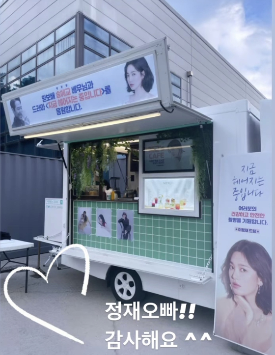 사진 속에는 이정재가 보낸 커피차가 있다. 송혜교는 사진에 하트를 그리며 이정재에 고마움을 전했다.