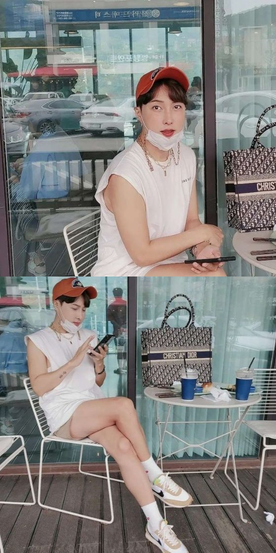 사진 속 김기수는 브런치 카페에서 여유로운 시간을 보내는 모습이다. 김기수는 짧은 바지로 매끈한 다리를 드러내고 있으며, 특히 테이블 위에 놓여있는 명품 가방이 눈길을 끈다.