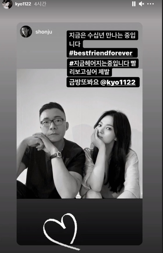 또한 주형선 헤어스타일리스트는 사진과 함께 "지금은 수십 년 만나는 중입니다"라면서 "bestfriendfoerever #지금 헤어지는 중입니다 빨리 보고 싶어 제발, 금방 또 봐요"라며 송혜교와의 두터운 친분을 드러냈다.