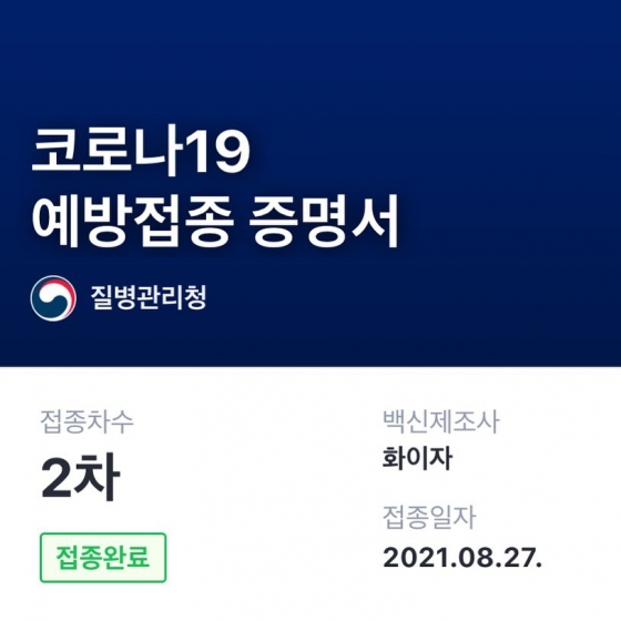 공개된 사진은 허지웅이 코로나19 2차 백신인 화이자 접종을 완료한 증명서.