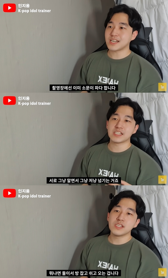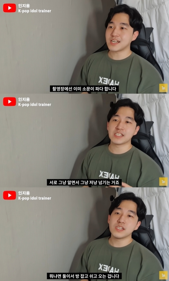 인지웅은 이어 "신인급은 휴게실에서 쉰다. 이런 건 쉬는 시간을 한두 시간씩 만들어낼 수 있는 짬(경력) 좀 찬 배우들이 한다"며 "그냥 갑자기 촬영하다가 '브레이크 타임 좀 가지고 싶은데' 이러면서 쉬는 시간 만들어내고 둘이서 사라져 버린다. 현장 스태프는 다 안다"고 덧붙였다.