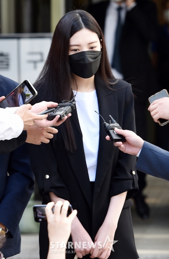 음주운전을 하다 교통사고를 낸 아이돌 그룹 애프터스쿨 출신 배우 리지(본명 박수영·29)가 27일 오전 서울 서초구 중앙지방법원에서 진행된 첫 공판을 마친 뒤 취재진 질의에 답하고 있다.
