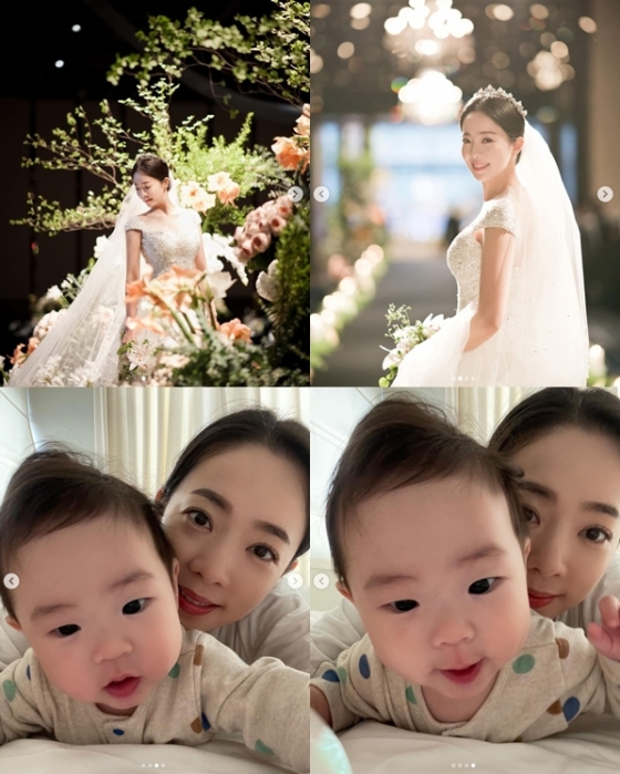 공개된 사진에는 결혼식 당시 웨딩드레스를 입은 박은영의 모습이 담겨 있다. 또 다른 속 박은영은 아들 범준 군과 함께 다정하게 카메라를 바라보고 있다.