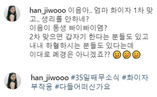 또한 한지우는 "35일째 무소식. 화이자 부작용. 다들 어떠신가요"라는 글도 남겼다.