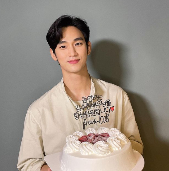 공개된 사진 속 김수현은 "김수현 배우님을 항상 응원합니다"란 글이 적힌 케이크를 들고 카메라를 응시한다. 특히 그의 잘생긴 외모가 이목을 집중시킨다.