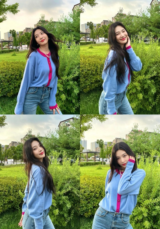 사진 속 조이는 풀숲에서 카메라를 보며 미소를 짓고 있다. 상큼하고 환한 조이의 매력이 돋보인다.