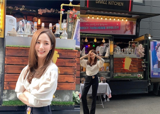 사진 속 박민영은 커피차 앞에서 포즈를 취하며 김세정을 위한 인증샷을 남겼다. 자연스러운 포즈지만 박민영의 인형 비주얼은 단연 돋보인다.