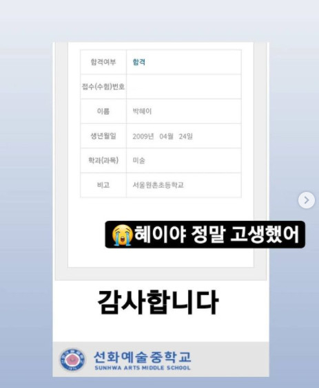 공개된 사진 속에는 김지혜의 딸 혜이 양이 선화예술중학교 입학 사실이 담겨있는 모습이 담겨있다.
