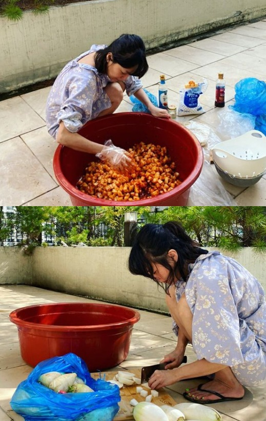 공개된 사진 속 고은아가 큰 대야에 깍두기를 만들고 있다. 정성스러운 모습이 돋보여 이목을 끈다.