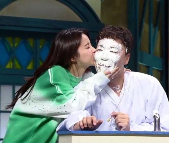 공개된 사진 속 그는 하얀색 거품으로 뒤덮인 얼굴을 하고 있다. 은가은은 이를 끌어안고 볼에 입을 맞추고 있는 모습이다.