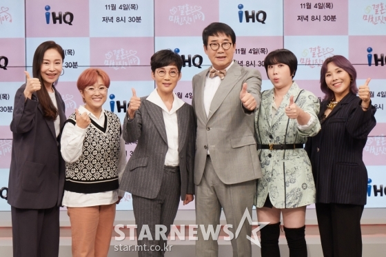 방송인 여윤정, 송은이, 팽현숙, 최양락, 권진영, 신봉선이 4일 오후 온라인으로 진행된 채널 IHQ의 예능프로그램 '결혼은 미친 짓이야' 제작발표회에 참석해 포즈를 취하고 있다.
