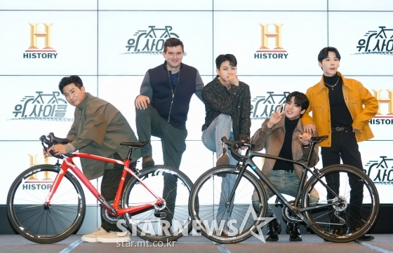 유세윤, 제임스 후퍼, 송윤형, 우석, 전웅이 19일 오후 서울 JW 메리어트 동대문 스퀘어에서 진행된 히스토리 오리지널 '위 사이클' 기자간담회 및 제작발표회에서 포즈를 취하고 있다.