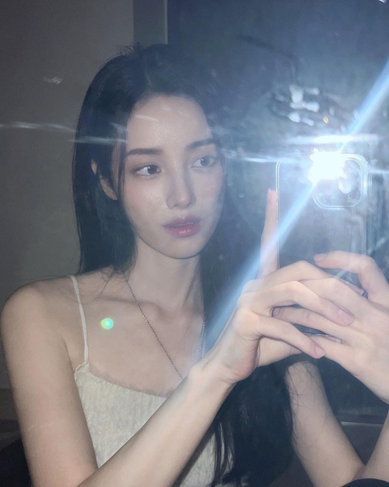 공개된 사진에는 유깻잎이 거울 셀카를 촬영한 모습이 담겼다. 유깻잎은 휴대전화 카메라 플래시보다 눈길을 끄는 미모를 뽐냈다. 쇄골에 V라인 턱선까지 여신미를 발산했다.