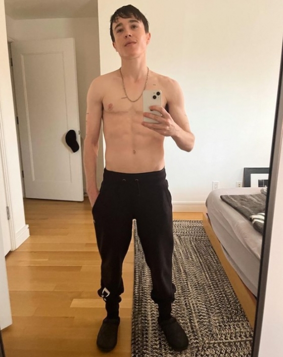 사진 속 엘리엇 페이지는 상의를 탈의하고 새 휴대폰으로 거울 셀카를 찍었다. 유방 절제술을 받은 엘리엇 페이지는 선명한 초콜릿 복근을 자랑하고 있다.