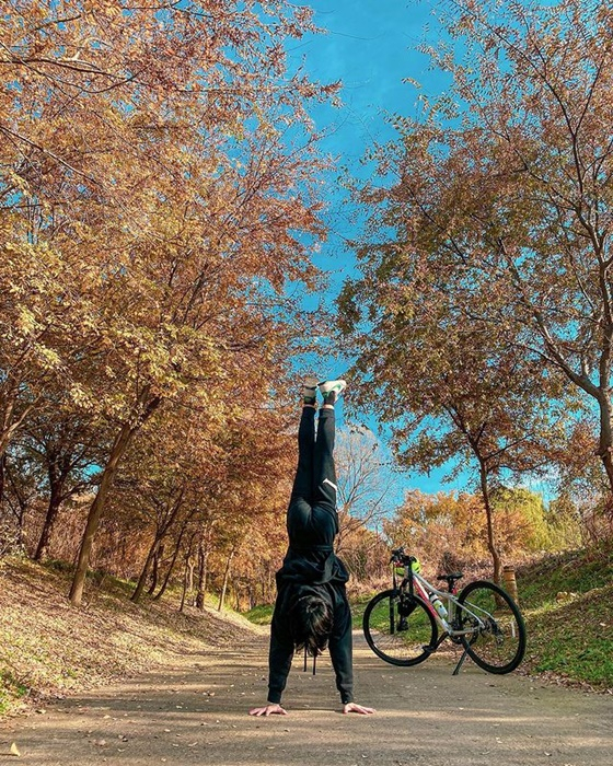 사진 속에는 단풍이 돋보이는 길 위에서 물구나무서기를 한 이수근 아들의 모습이 담겨있다. 긴 다리와 완벽한 자세를 유지하는 뛰어난 코어 힘이 눈길을 사로잡는다.