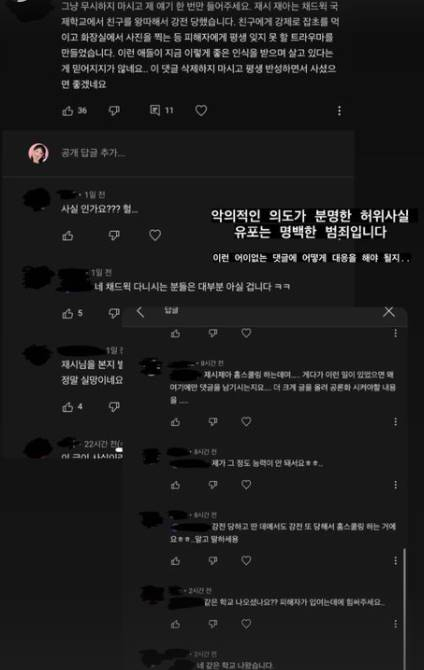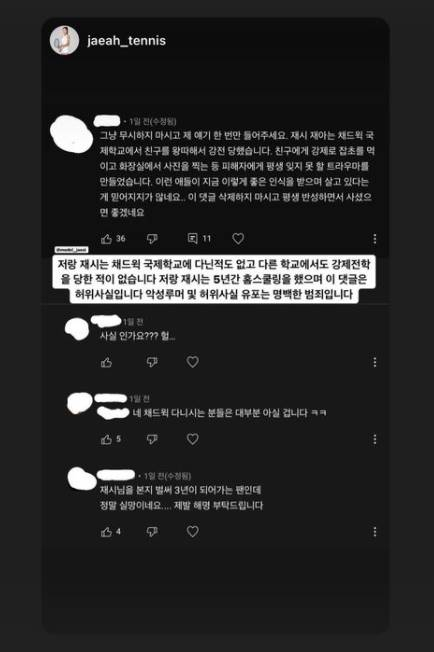 해당 캡처에는 한 네티즌이 "재시, 재아는 채드윅 국제학교에서 친구를 왕따당해서 강전(강제 전학) 당했다. 친구에게 강제를 잡초를 먹이고 화장실에서 사진을 찍는 등 피해자에게 평생 잊지 못할 트라우마를 만들었다. 이런 애들이 지금 이렇게 좋은 인식을 받으며 살고 있다는 게 믿어지지가 않는다. 이 댓글 삭제하지 마시고 평생 반성하면서 사셨으면 좋겠다"라는 내용으로 글을 작성했다.