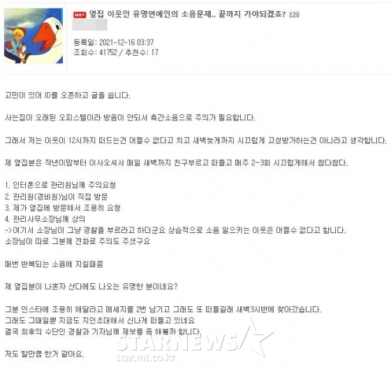 지난 16일 온라인 커뮤니티에는 "옆집 이웃인 유명 연예인의 소음문제.. 끝까지 가야 되겠죠?"라는 제목으로 글이 올라왔다.