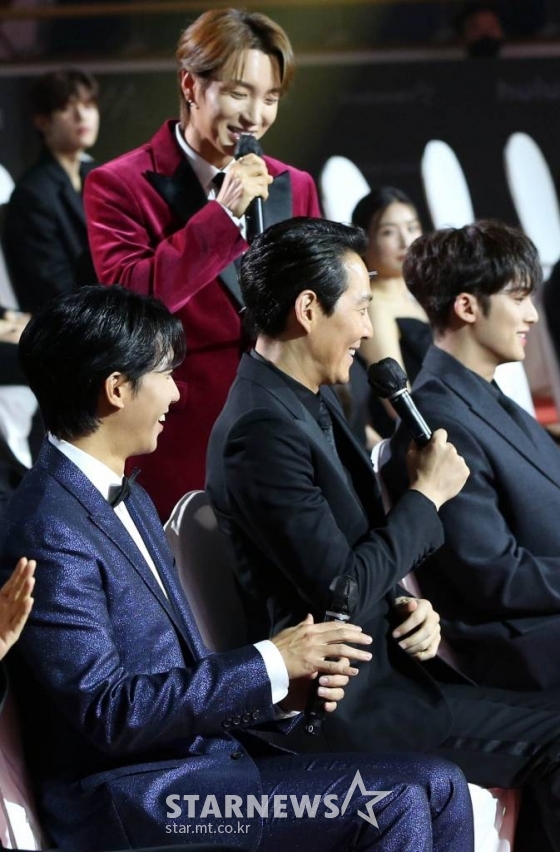 이특과 이정재, 이승기가 2일 오후 서울 강서구 KBS아레나에서 진행된 '2021 Asia Artist Awards(2021 아시아 아티스트 어워즈, 2021 AAA)' 시상식에서 객석 인터뷰를 진행하고 있다. 스타뉴스가 주최하고 AAA 조직위원회가 주관하는 AAA는 어디에서도 보지 못했던 새로운 무대를 선보이며 전 세계 팬들의 눈과 귀를 사로잡아 명실상부 NO.1 글로벌 시상식으로 거듭났다. /사진=AAA 기자 star@