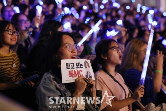 26일(현지시간) 베트남 하노이 미딩 국립경기장에서 스타뉴스 주최로 열린 '2019 아시아 아티스트 어워즈 인 베트남(2019 Asia Artist Awards in Vietnam)'을 찾은 관객들이 MC 이특 응원 카드를 들고 시상식을 즐기고 있다. /사진=하노이(베트남)=이기범 기자 leekb@