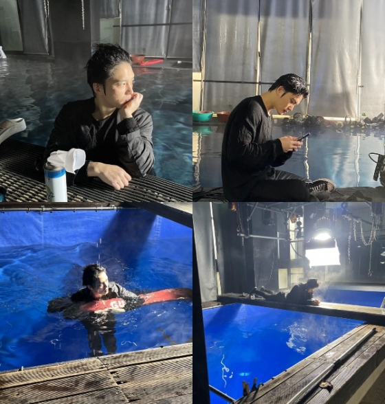 공개된 사진 속에는 김재중이 수영장이 있는 세트장에서 촬영을 하는 모습이 담겼다.