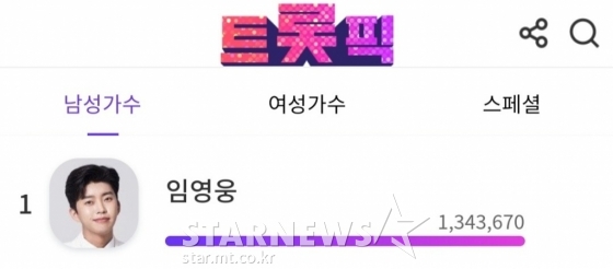 임영웅은 트로트 스타 웹서비스 '트롯픽'(Trotpick)에서 12월 27일부터 1월 2일까지 진행된 위클리 투표에서 134만 3670표로 압도적 1위를 차지했다.