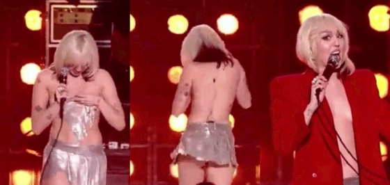 미국 가수 마일리 사이러스가 생방송 무대 도중 상의가 벗겨지는 돌발상황에도 노련하게 대처했다.