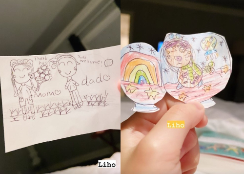 이어 다른 스토리에는 "Liho"라는 글과 함께 딸 리호 양이 손태영과 권상우를 그린 그림 사진이 담겼다.