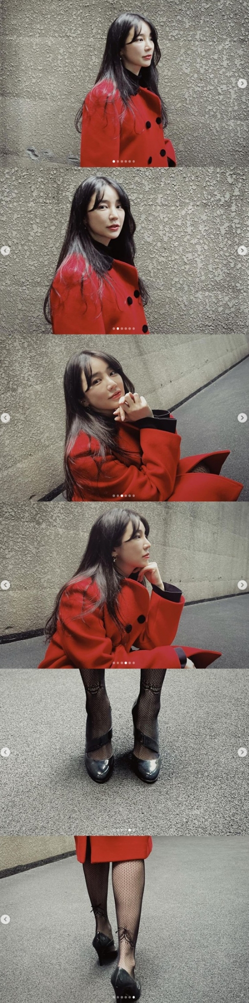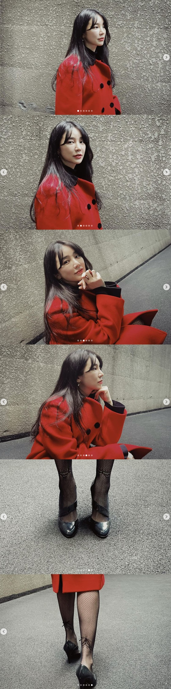 사진 속 윤은혜는 레드 코트를 입고 화사한 모습으로 포즈를 취하고 있다. 블랙 망사스타킹으로 늘씬한 몸매를 자랑한다. 올해 39살이 된 윤은혜는 나이가 믿기지 않는 동안 미모로 시선을 사로잡는다.