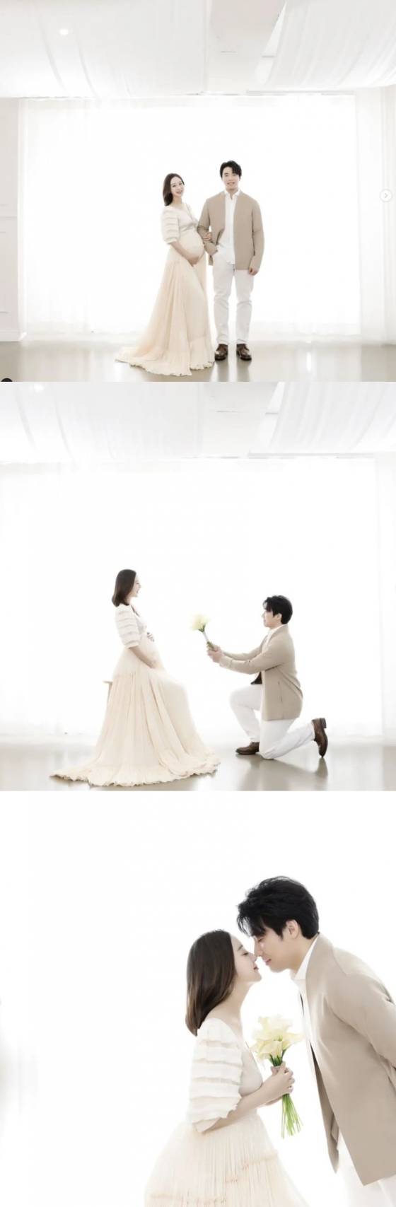 공개된 사진 속 그는 아름다운 D라인을 뽐내고 있다. 남편인 신민철과 함께 만삭 화보를 촬영하며 은은한 미소를 머금고 있다.