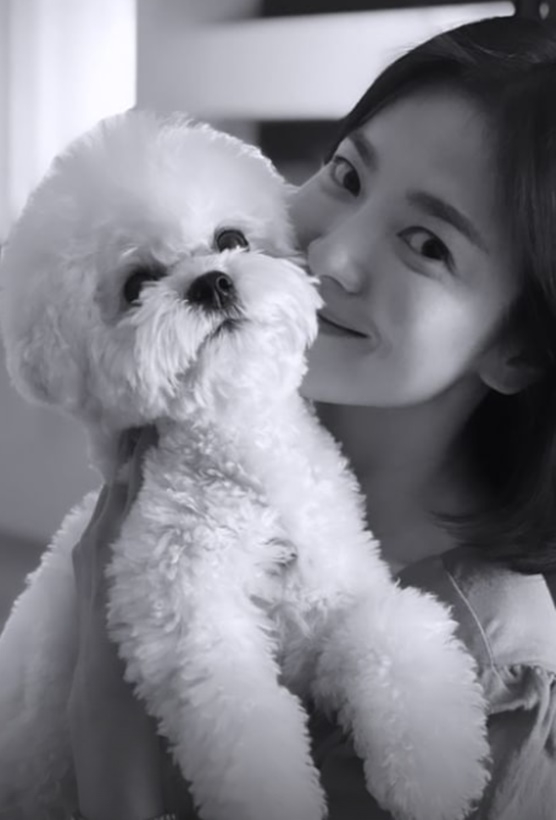 공개 된 사진 속 송혜교는 끌어안고 얼굴을 밀착하며 미소 짓고 있다. 반려견을 사랑하는 모습이 느껴진다.