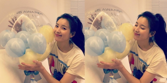 공개된 사진 속 한효주는 'TVING AWARDS SNS 투표 1위 해피니스 한효주님 감사합니다!'라는 문구가 적힌 풍선을 들고 미소를 띠고 있다.