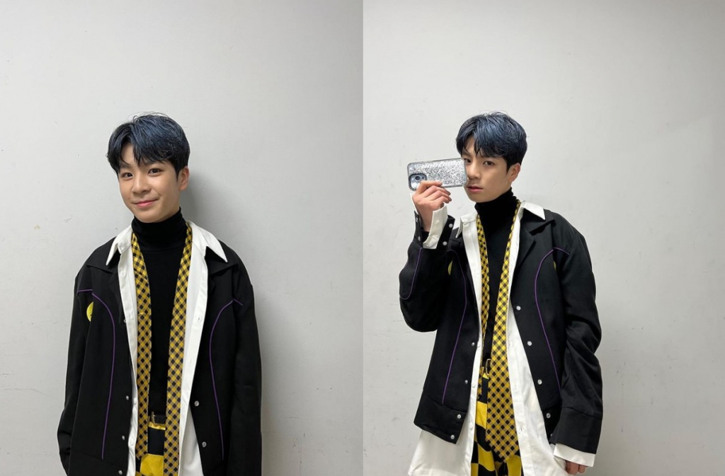 20일 정동원은 자신의 인스타그램을 통해 "컨셉명 - 빤짝이 오늘 밤 10시 국민가수 갈라쇼 LBJONE"라는 글과 함께 두 장의 사진을 게재했다.
