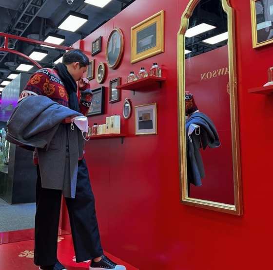 공개된 사진 속 문세훈은 더현대 팝업스토어에서 검정 머플러를 두른 채 향을 맡고 있다.