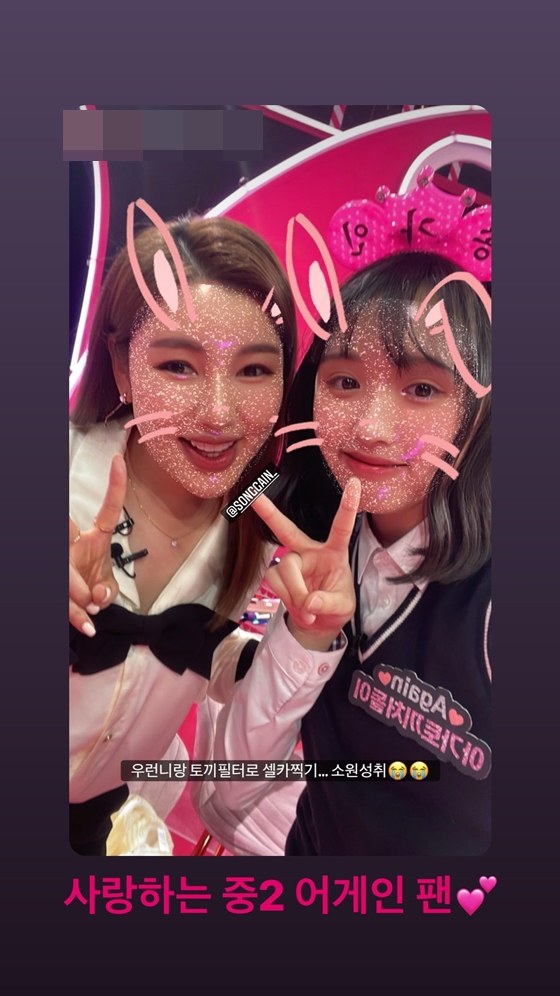 송가인은 지난 20일 자신의 인스타그램 스토리에 '사랑하는 중2 어게인 팬'이라는 문구가 담긴 사진을 게재했다. 또래 친구들과 달리 송가인의 열성 팬이 기념 촬영 사진을 공유한 것.