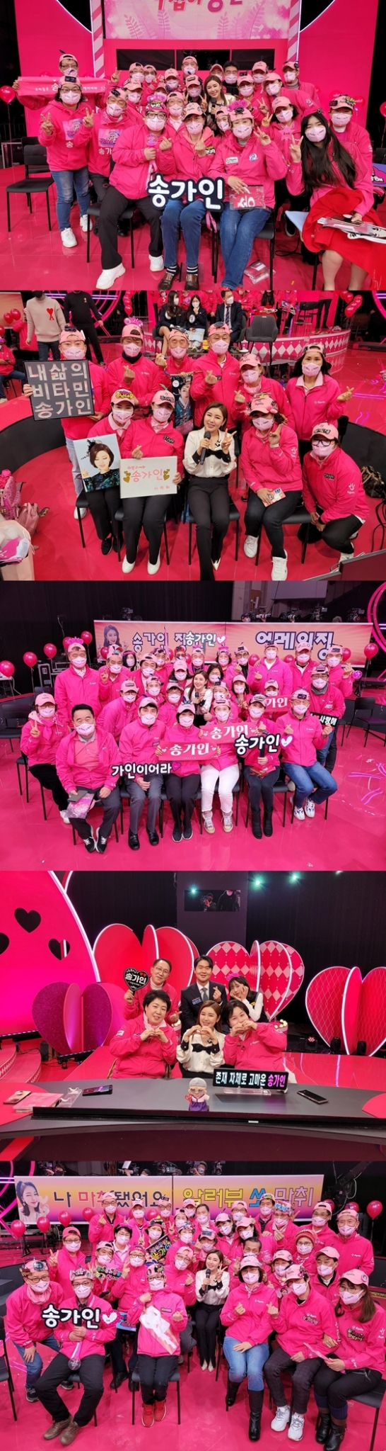 공개된 사진에는 송가인이 팬클럽 어게인 회원들과 함께 한 모습이 담겼다. 이는 지난 20일 방송된 KBS 2TV '팬심자랑대회 주접이 풍년'(이하 '주접이 풍년')에 출연한 송가인과 팬클럽 어게인(AGAIN) 회원들이 함께 한 모습이다.