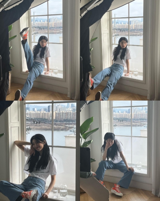 공개된 사진 속 수지는 청바지에 흰 티를 입고 창가에 걸터앉아 포즈를 취하고 있다.