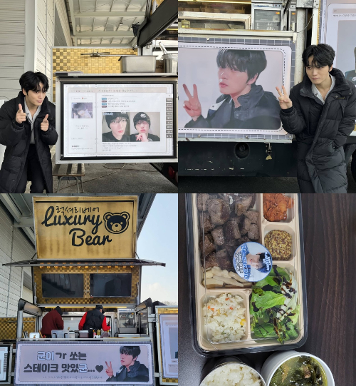 공개된 사진 속 김재중은 팬들에게 선물로 받은 '밥차' 옆에서 엄지를 치켜들며 포즈를 취하고 있다. 다른 사진에는 김재중이 언급한 스테이크 도시락이 담겼다. 특히 김재중 생일이라 함께 보낸 미역국도 눈길을 끈다.