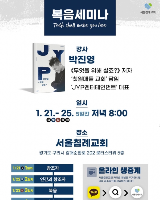 너무 감사합니다 정말 많은 분들이 DM을 주시며 걱정을 하시더라구요. 처음엔 아니라니까요 라고 조금은 화도났지만…ㅋㅋㅋ 근데 어느 순간…정말 감사하단 생각이 들었습니다. 제가 뭐라고 어떤 길을 가던 신경 안쓰셔도 되는데 긴 글을 써서 보내주신 분들의 글을 읽다보니 그분들의 진심이 느껴졌습니다. 정말 감사합니다. 무엇을 걱정하는지도 잘 알고 있어요 다시 한번 말씀드리지만 아닙니다. 이제 이런 질문과 이야기는 그만하고…제 이야기 조금만 들어주세요. 이 공간은 제 공간이니 조금만 제 이야기 들어주세요. 전 10년 전 부터 저랑 같은 직업을 가지고 있는 동료들과 하나님을 전하면 너무 좋겠다는 소망을 가지고 있었습니다. 그래서 모임도 했구요 그때 저랑 함께한 연예인분들이 증인이 되어주겠지요. 하지만 전 그때 하지 못했습니다. 저에 부족함이였겠지요. 하지만 포기는 하지 않았습니다~~^^ 글라스바틀이라는 유튜브 공간에서 좋은분들과 예수님을 이야기 하고 있으니까여( 글라스바틀 가족분들께 너무 감사합니다) 전 늘 소망하는거 같아요 저희가 가진 것으로 예수님을 전할수 이따면 얼마나 좋을까 많은 청소년들이 그리고 예수님을 모르던 분들이 우리의 이름은 알기에 관심을 가져 우리의 이야기가 예수님을 만나는 첫 걸음이 된다면…얼마나 행복한 일일까? 그러던 중 진영이 형이 예수님을 전한다는 이야기를 들었어요. 엥??? 내가 아는 그 박진영?? 엥?? 내가 아는 모든 사람중에 제일 잘 놀줄아는 그 형?? 처음에는 뭐지 하는 생각에 그냥 전화걸어 밥사달라고 하고 만났는데 하필이면 그때가 진영이 형이 성경은 믿는데 본인이 믿음이 없을때였어요…그래서 뭐지?? 아니잖아 했는데 그러고 몇년이따 형을 만났는데…할렐루야~~~!!! 예수님이 죄인인 형을 위해 돌아가셨다는 걸 믿는다고 이젠 믿어진다고 하면서 예수님을 전하는거에요…여러분 생각해 보세여 JYP가 예수님을 전하는 정말 신실한 일꾼이 된거에여!!! 여러분 정말 기쁘지 않으세요?? 정말 같이 예수님을 믿는 사람들로써 정말 행복한일 아닌가요? 그 놀던 형이 구원을 받아 천국백성이 되었다는게?? 몇일전 형이 전하는 예수님을 5일동안 하루에 2시간씩 뒤에서 지켜봤습니다. 얼마나 감사한지 진영이 형이 한다고 하니 정말 많은 분들이 오셨어요 그리고 예수님을 구원자 이심을 받아들인 분들도 많았구요…얼마나 기쁘던지 근데 여러분 생각해 보세여 우리편이래여!!(아!!제발!! ㄱㅇㅍ아니구요!!) 진짜 우리편이여 날 떠나지마 노래부르던 그 형이 엘레베이터 부르던 그 형이 이젠 예수님을 전하는 우리편이라구요!!! 잠시 한번 생각해 보세요. 여러분 정말 그 쪽으로 진영이 형을 빼앗겼다면… 얼마나 슬펐을까여? 얼마나 마음이 아팠을까요? 근데!! 얼마나 감사합니까 내가 지금보는 이 성경 예수님이 보라는 말씀과 진리를 제대로 보고 우리가 아는 그 예수님을 우리처럼 보고 있으니….여러분 세상의 딴따라이지만 저도 그렇고요 우리가 할수 있는 모습으로 예수님을 전할수 이따면……여러분 형을 위해 기도해주실수 있으세요? 한번이 아닌 죽을때까지 예수님을 전하겠다고 예수님과 약속한 그 딴따라 형을 위해 같이 중보해주실수 있으세요? 전 부족해서 못한 일을 형이 하고 있어 전 작지만 형을 위해 매일 중보 하려고 합니다. 이젠 예수님의 딴따라로 사는 형을 위해…저랑 같이 기도 해주실수 있으세요?