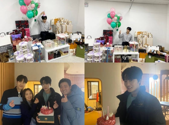 공개된 사진 속 김재중은 생일선물에 둘러싸여 있다. 다른 사진에는 동료 배우들과 함께 생일 케이크를 들고 포즈를 취하고 있다.
