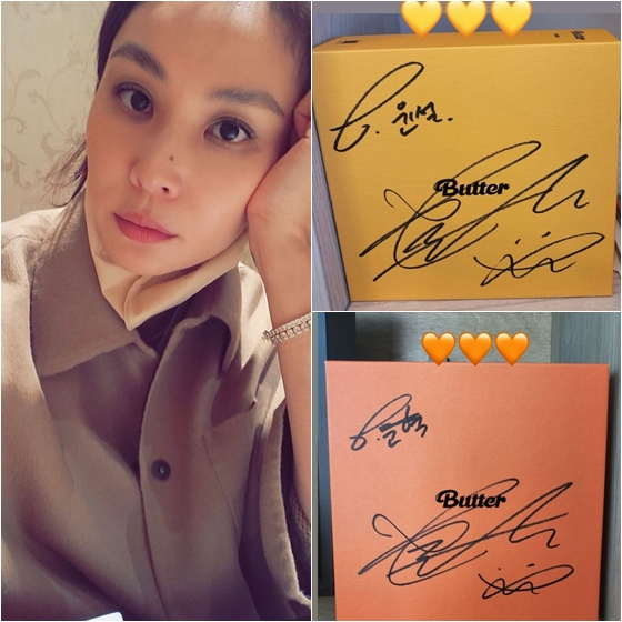 공개된 사진에는 방탄소년단의 싱글 'Butter' 음반의 모습이 담겨 있다. 이 음반에는 고소영의 두 남매 이름과 함께 방탄소년단 사인이 적혀 있어 눈길을 끌었다.