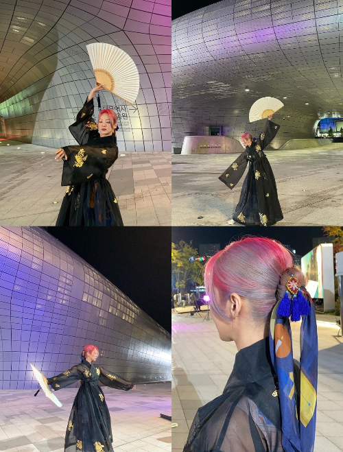 공개된 사진 속 효연은 검정 한복을 입은 채 부채를 들고 춤사위를 선보이는 모습이 담겼다. 다른 사진에는 효연의 화려한 머리 장신구가 눈길을 끈다.