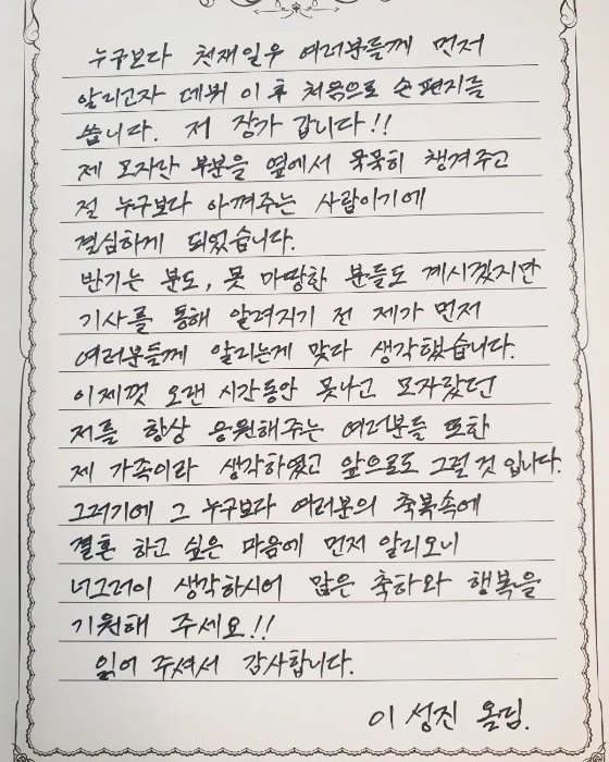 이성진은 손편지를 통해 "누구보다 천재일우 여러분들께 먼저 알리고자 데뷔 이후 처음으로 손편지를 씁니다. 저 장가갑니다!"라고 했다.