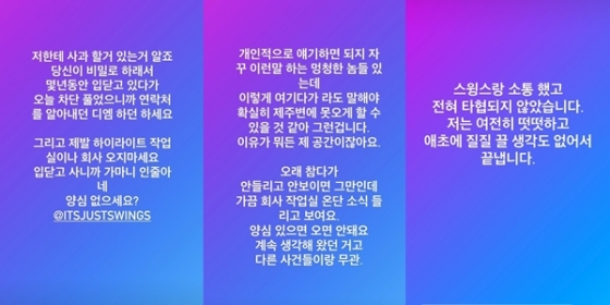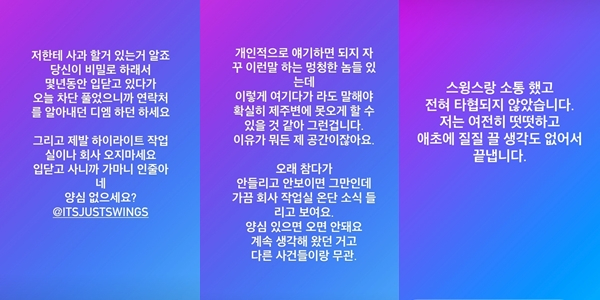애쉬비는 16일 새벽 자신의 인스타그램 스토리에 스윙스 계정을 태그하며 "저한테 사과할 거 있는 거 알죠. 당신이 비밀로 하래서 몇 년 동안 입닫고 있다가 오늘 차단 풀었으니까 연락처를 알아내던 디엠 하던 하세요"라고 전했다.