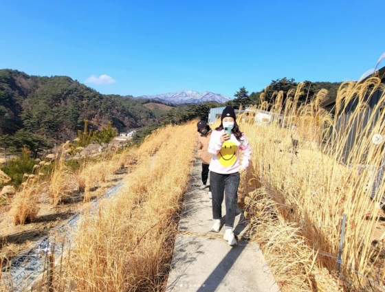 사진에서 하재숙은 길을 따라 어디론가 걸어가고 있다.
