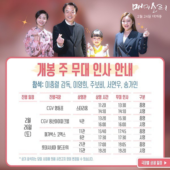 공개된 사진은 송가인이 '매미소리' 무대 인사에 참석하는 일정이 담겼다. 오는 26일로 CGV 영등포, CGV 용산아이파크몰, 메가박스 코엑스, 롯데시네마 월드타워 등에서 진행되는 무대인사에 송가인이 이충렬 감독, 이양희, 주보비, 서영우 등과 참석한다고 되어 있다.