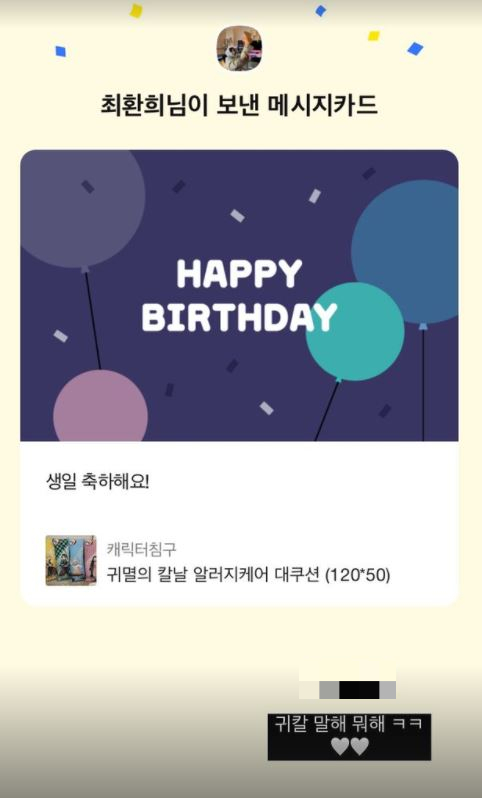 최환희는 동생 최준희가 좋아하는 애니메이션의 알러지케어 대쿠션을 보냈고 최준희는 하트로 반응하며 감사함을 표시했다.