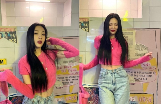 공개된 사진 속 조이는 허리가 드러나는 핑크 탑 니트와 청바지를 입고 포즈를 취하고 있다.