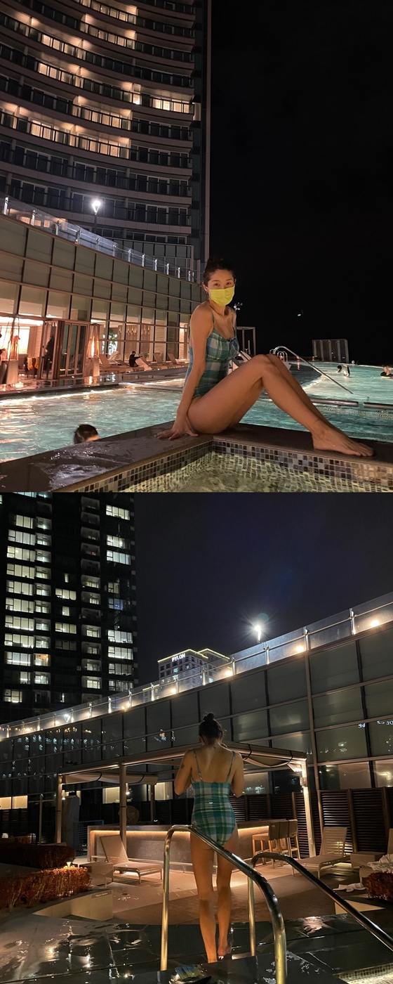 공개된 사진에는 김빈우가 수영장에있는 모습이 담겼다. 마스크를 착용하고 있는 그녀는 건강미와 섹시함이 조화를 이룬 각선미를 뽐내고 있다.